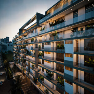 A defining feature of the development is its integration of biophilic design principles. Abundant greenery punctuates each level, with carefully curated planters introducing natural elements throughout the building's vertical composition. This vertical landscaping not only enhances aesthetic appeal but also contributes to improved air quality and resident wellbeing.